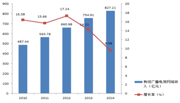 第四階段,2010 年至今,三網融合發展階段;傳統的有線廣播電視網絡開始數字化、寬帶化、交互化、智能化發展,已有 23 個省市的有線網絡獲得互聯網相關資質,有線網絡逐漸與互聯網融合發展。根據廣電總局發布的《中國廣播電影電視發展報告(2015)》,截至 2014 年年末,全國有線廣播電視用戶數約為2.35 億戶,比 2013 年增加超過 560 萬戶,增長了 2.47%,較 2013 年 6.44%的增幅減少 3.97 個百分點?傮w上,2010 年至 2014 年傳統廣播電視行業的收入處于增長狀態,但增速逐漸放緩,具體如下圖所示: