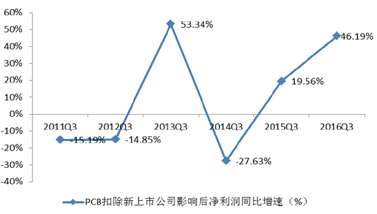 PCB 子類整體營收平穩增長,凈利潤增速反轉。2016 年三季度PCB 子類整體營收增速為13.70%,2015 年同期增速為0.46%,增長超過13 個百分點。凈利潤方面,2016 年三季度增速為46.19%,2015 年同期為增長0.46%。
