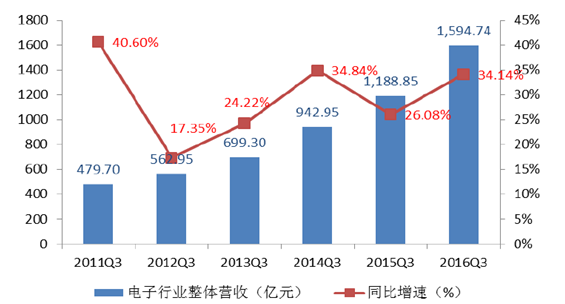 核心提示:截止10月底,電子行業各公司中報均已披露完畢。2016年三季度,電子行業整體營業總收入為1594.7億元,較2015年三季度增長34.14%。在申萬28個行業分類中,電子行業整體營收增速位列第2位。2011-2016年中國電子行業整體營業收截止10月底,電子行業各公司中報均已披露完畢。2016年三季度,電子行業整體營業總收入為1594.7億元,較2015年三季度增長34.14%。在申萬28個行業分類中,電子行業整體營收增速位列第2位。