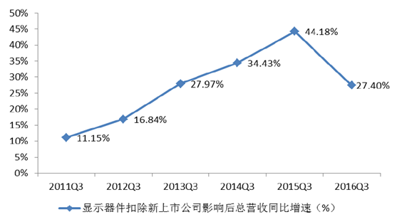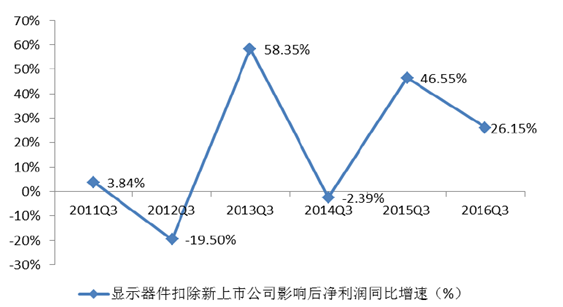 顯示器件子類中京東方體量太大,對整體子類營收及凈利潤影響大,如果不考慮京東方,顯示器件子類2016年三季度整體營收增速為27.4%,2015年增速為44.18%,下滑超16個百分點。凈利潤增速為26.15%,2015年同期為46.55%,下滑超20個百分點。
