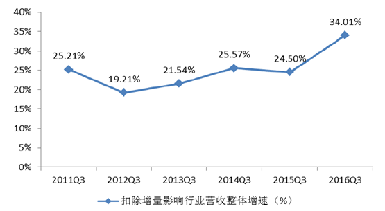 直接加總每年三季報所有公司總體營業收入,使得對比公司數量口徑不同。2015 年三季報后有新公司上市,如果直接加總2016 年三季報所有公司營業總收入與2015 年相比,則2016 年三季報總體營業收入數據統計公司比2015 年多,對比口徑不一。因此,扣除新上市公司影響后同期對比更能夠反映行業整體增速情況。