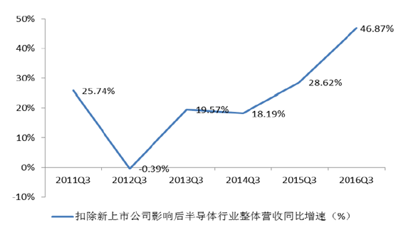 2016 年三季度,長電科技對星科金朋并表,及韓國子公司JSCK 三季度量產單來營收增量1.95 億美元,使得長電科技三季度營收同比增加超26 億元,使得半導體行業三季度整體營收較去年同期增長46.87%,比2015年三季度增速增長超過18個百分點。