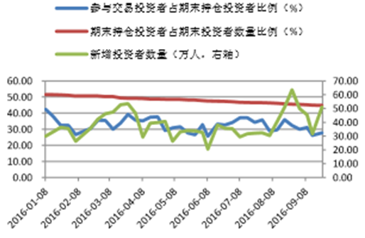 三季度以來,市場整體呈現震蕩上揚格局,投資者熱情有所恢復,新增投資人數雖有波動,但整體來看較此前有明顯增長。但持倉投資者占投資者總數的比例仍延續此前緩慢下降的趨勢,沒有明顯改變。截止9月23日,期末持倉投資者占期末投資者數量比例為44.76%。