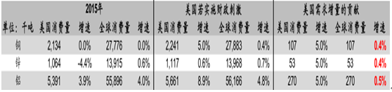 據(jù)預(yù)測,在基準(zhǔn)假設(shè)下,若 Trump 嚴(yán)格執(zhí)行其競選綱領(lǐng),2017-2020年基建投資在現(xiàn)有基礎(chǔ)上增加 5500 億美元,則美國未來 4 年的基建投資名義增長率將增加 5.6ppt 至 8.5%;同時假設(shè)基建投資大約占比 30%,則意味著固定資產(chǎn)投資增速在原有基礎(chǔ)上增長 1.7%,帶動美國國內(nèi)基本金屬需求增長有望重新回到 5%以上的水平。