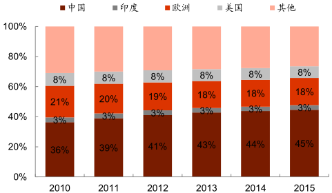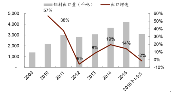 美國占中國鋁材出口份額的 10%。由于中國政府對原鋁出口設(shè)臵了 5%的出口關(guān)稅且不退還增值稅,國內(nèi)基本沒有原鋁出口,普遍以鋁加工材的形式銷售至國外,2009 年中國出口至美國的鋁材占出口總量的 19%。2010 年 4 月美國對原產(chǎn)于中國的鋁型材進(jìn)行反傾銷和反補(bǔ)貼立案調(diào)查,并于次年 4 月做出商務(wù)部做出仲裁:分別對中國涉案鋁型材出口企業(yè)征收 32.79%~33.28%的反傾銷稅。受此次事件的影響,中國出口至美國的鋁材出口占比降至 10%左右。
