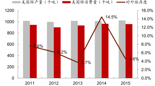美國鋅消費對外依存度為 5%