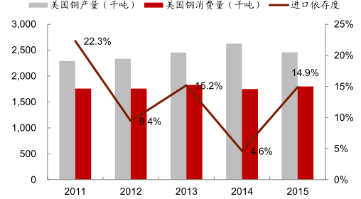 美國銅消費對外依存度為 15%