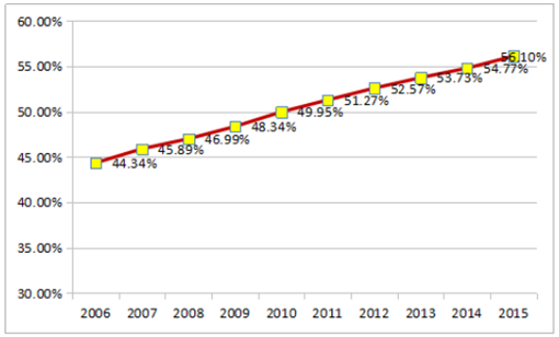 我國城市化的持續快速發展是促進木門行業發展的直接動力。目前我國城市化進程仍處于高速發展時期, 2015 年我國城市化率達到 56.10%,與十年前相比增長了 11.76 個百分點。根據國家發改委的測算,到 2020 年,城市化率將達到59%,平均每年提高 1 個百分點左右;未來 10 年,我國的城市化率仍將保持速增長,城市化率的提高將推動城鎮住房的需求,進而推動對木門的需求。