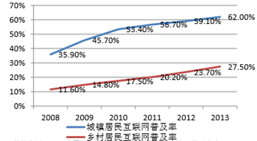隨著互聯網設 施成本的降低,農村互聯網應用加 速,2013年,農村網民規模的增長速 度為13.5%,城鎮網民規模的增長速 度為8.0%,城鄉網民規模的差距繼續 縮小。