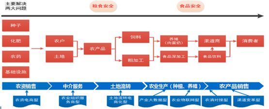 互聯網將對整個農業產業鏈進行改造。從農資銷售、中介服務、土地流轉到農業生 產、農產品銷售,整個完整的農業產業鏈上都已經出現了(移動)互聯網、大數據的 身影。國內涉農互聯網企業主要有7種類型,分別為:1)農產品銷售渠道變革型; 2)產業鏈大數據型;3)專業合作社服務商;4)數據挖掘型;5) 農業物聯網;6) 土地流轉電商化;7)農資電商型。