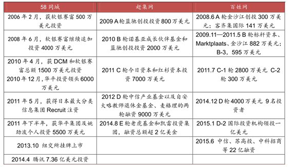 三強之爭 :融資 、 燒錢 、廣告 。經歷了 2005—2006 年的井噴式發展和2007—2008 年的大浪淘沙,分類信息行業形成了 58 同城、趕集網、百姓網三足鼎立的競爭格局。但行業競爭并未因為企業數量的減少而停息,58 同城和趕集網分別打出廣告牌,“騎驢趕集”和“一個神奇的網站”的廣告耗資均超過億元,而兩家企業的銷售隊伍均接近萬人;百姓網盡管在公司戰略上與前二者有所不同,但行業的惡性競爭和公司的拓展同樣要求大量的資金。因此,分類信息行業幾乎成為了資本角逐的舞臺,據不完全統計,58 同城成立以來完成了至少 8 筆融資,包括紐交所上市和騰訊超過 7 億美元的戰略入股;百姓網也完成了 D 輪融資,并在去年吸引國內資本近 22 億元人民幣。這種融資燒錢的情況一直延續到 2015年 4 月,58 同城入股趕集網,才有停止的跡象。