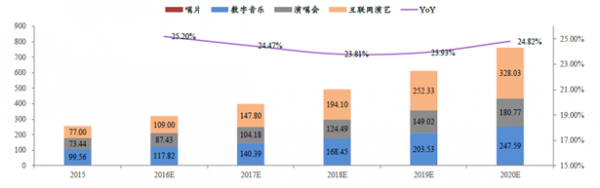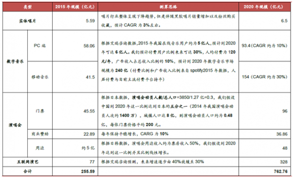 綜上,我們估算2015年偶像音樂市場約為100.28億,到2020年可達(dá)494.59億元,CAGR約為31%。