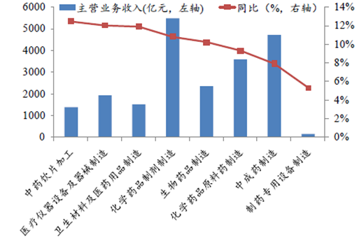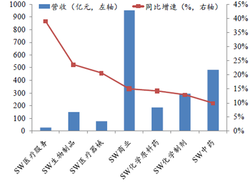 從工業各子行業來看,主營業務收入增長最快的是中藥飲片和醫療儀器設備及器械,增速同比有較大提升的是化學藥品制劑制造、生物藥品制造以及中成藥制造等;利潤增長最快的是醫療儀器設備及器械、化學原料藥以及化學藥品制劑制造,受GMP認證高峰過去的影響,制藥設備的利潤出現負增長。從上市公司情況來看,從前三季度各子行業數據來看,生物制品、醫療服務、醫藥商業增速都在15%以上,化學原料藥及生物制品凈利潤增速較高。