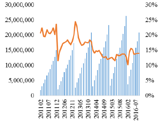 2016年1-9 月醫藥制造行業規模以上企業實現營業收入21034.14 億元,同比增長10.09%,高于去年同期增速;實現利潤總額2200.97 億元,同比增長15.64%。短期來看,兩票制、招標降價、一致性評價等政策將繼續對行業的發展產生負面影響,中長期來看,消費水平提升、人口老齡化、二胎政策等都將為醫藥行業的長期穩健增長提供支撐,預計行業營收增速在10%之上窄幅震蕩。另外,利潤增速繼續高于營收增速,顯示出醫藥行業較強的盈利能力。