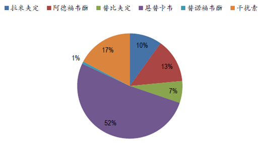 由于替諾福韋上市時間短,恩替卡韋一支獨秀,在我國核苷類抗乙肝藥物的市場中,份額逐漸升高,已經成為我國治療乙肝的主要用藥。2015年,恩替卡韋的銷售額約占抗乙肝藥物市場的52%。而拉米夫定和阿德福韋酯的市場份額逐漸降低,二者市場份額合計約占30%左右。替諾福韋由于此前價格較高,且不在醫保(沒有趕上09年醫保調整),目前市場份額還較小。