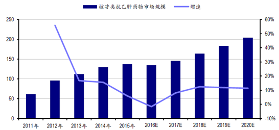 近年來,我國治療乙肝用藥的市場規模已從2011年的68.81億元增長到2015年的162.76億元,CAGR為22.4%,增速較快。其中醫院市場是肝病藥物銷售的主要渠道,市場份額占比約為80%。預計到2020年我國乙肝用藥市場規模將達到200億元。2016-2020年我國抗乙肝用藥市場規模