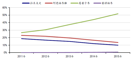 2011-2015年不同類核苷類抗乙肝藥物市場份額變化