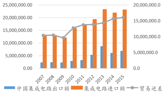 中國集成電路進出口規模及貿易逆差(萬美元)