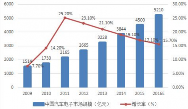 國內(nèi)汽車電子滲透率與國外有明顯差距。相對國外 25%左右的汽車電子滲透率,目前國內(nèi)汽車電子滲透率不足 20%,未來國內(nèi)滲透率仍將保持快速升。預(yù)計今后幾年國內(nèi)汽車電子市場規(guī)模將保持 10%-15%的增長,2016 年市場規(guī)模將超過 5000 億元。