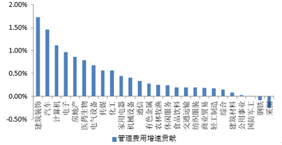 增量,前者如汽車、房地產、電子、醫藥等管理費用增長基本與營收增長同步、人員工資上漲則主要體現在建筑裝飾行業;計算機、家電,其管理費用的較高增長主要由于研發投入的增加以及人員工資的增長。此外,如機械、商貿、鋼鐵等行業營收端負增長,但因費用較剛性管理費用仍呈正增長。圖表 26 : 各行業對全行業管理費用增長的貢獻
