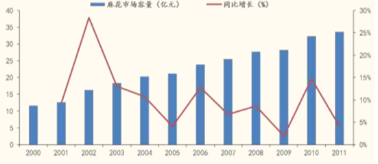 2000年我國麻花市場規模為11.57億元,2011年達到了33.66億元,CAGR為10.20%,增長速度較快。隨著居民消費水平不斷提高,麻花行業快速發展,預計2016年我國麻花市場規模將達到60.03億元,預計2016-2020年行業CAGR將保持在10%左右。2012-2014年,公司麻花產品在全國市場的平均市占率分別為8.78%、8.34%和7.13%。處于行業領先水平,隨著募投項目實施后公司產能的擴大、新產品的開發、品牌推廣的深入,麻花產品的市占率將進一步提高。