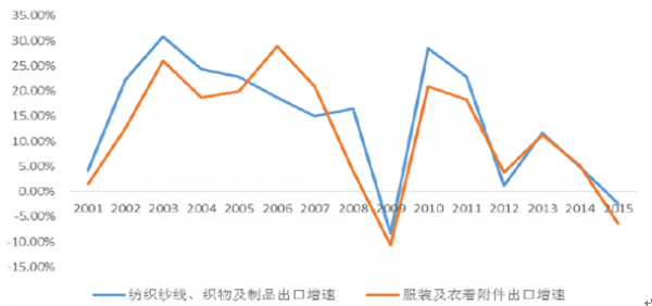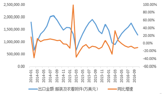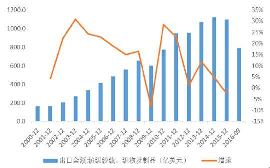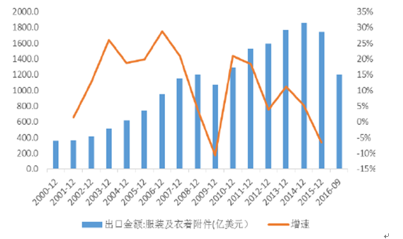 但是近年來這一趨勢的保持卻存在著逐漸增加的壓力,面對復雜的國內外形勢,由于世界主要經濟體復蘇緩慢、外需增長乏力,加之人民幣匯率波動等因素的影響,紡織服裝出口增速近年變化較大,2010 年之后出現進出口增速持續下滑的情況,在2015 年出現過近6 年首次進出口雙降現象,而今年截至9 月這一現象仍在延續。服裝出口自今年5 月開始持續下滑,9 月份跌幅有所加大。9 月份,服裝及衣著附件出口150.4 億美元,同比下降12.56%,較8 月,跌幅擴大5 個百分點,服裝及衣著附件進口5.95 億美元,同比下降4%。