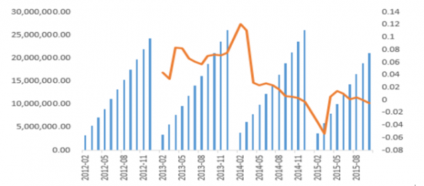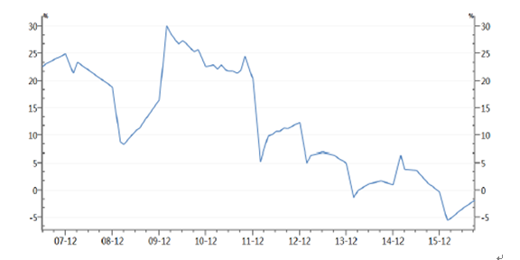 2007-2015年全國百家大型零售企業服裝類零售額YOY