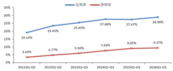 受益于渠道與產(chǎn)品結(jié)構(gòu)升級影響,白電子行業(yè)毛利率與凈利率均明顯提升:2016年前三季度毛利率同比增長1.51pct至28.98%,凈利率上升0.32pct至9.37%。