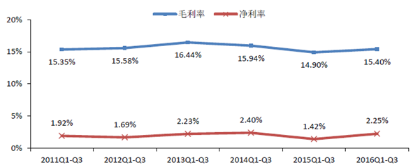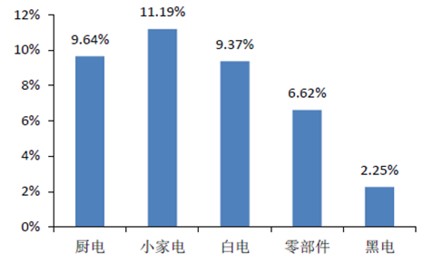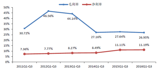 2016Q1-Q3小家電板塊凈利率水平最高,為11.19%