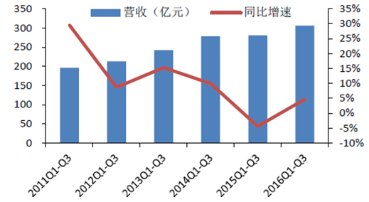 2016Q1-Q3家電行業(yè)整體營收同比增長2.20%