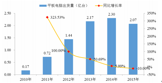 2010 年蘋果公司推出 iPad 使全世界掀起了平板電腦熱潮, 2011 年至 2015年,全球平板電腦出貨量分別達到了 0.72 億臺、 1.44 億臺、 2.17 億臺、 2.30 億臺及 2.07 億臺。 Display Search 發布預測稱,未來平板電腦出貨量將大幅增長,到 2017 年全球銷量將達到 4.55 億臺,屆時平板電腦將占據便攜電腦市場 75%的份額2,成本降低和顯示技術的持續發展將推動平板電腦市場繼續擴大,但鑒于目前消費者需求已部分激發,平板電腦銷售量基數變大,未來幾年平板電腦銷售量增長速度勢必有所下降。 2010 年至 2015 年平板電腦全球出貨量及同比增長率如下圖所示:
