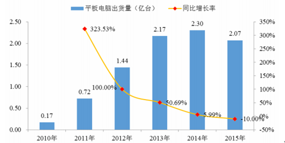 2010 年蘋果公司推出 iPad 使全世界掀起了平板電腦熱潮, 2011 年至 2015年,全球平板電腦出貨量分別達到了 0.72 億臺、 1.44 億臺、 2.17 億臺、 2.30 億臺及 2.07 億臺。 Display Search 發布預測稱,未來平板電腦出貨量將大幅增長,到 2017 年全球銷量將達到 4.55 億臺,屆時平板電腦將占據便攜電腦市場 75%的份額2,成本降低和顯示技術的持續發展將推動平板電腦市場繼續擴大,但鑒于目前消費者需求已部分激發,平板電腦銷售量基數變大,未來幾年平板電腦銷售量增長速度勢必有所下降。 2010 年至 2015 年平板電腦全球出貨量及同比增長率如下圖所示: