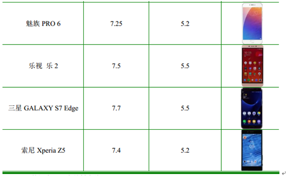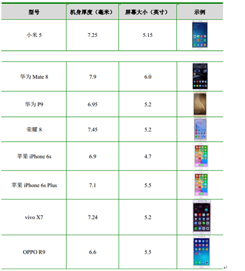 主要智能手機機身厚度和屏幕大小情況如下表所示: