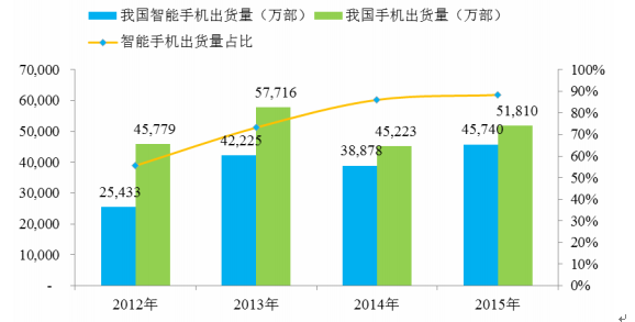 我國手機、智能手機行業近四年來也發展迅速, 2012 年至 2015 年,我國智能手機出貨量分別達到 25,433 萬部、 42,225 萬部、 38,878 萬部及 45,740 萬部,占全球智能手機出貨量的比重分別為 35.08%、 42.06%、 29.88%及 31.94%; 2012年至 2015 年,我國手機出貨量分別達到了 45,779 萬部、 57,716 萬部、 45,223 萬部及 51,810 萬部,占全球手機出貨量的比重分別為 26.34%、 31.68%、 24.07%及26.30%。 2012 年至 2015 年,我國智能手機出貨量占我國手機出貨量的比例分別為 55.56%、 73.16%、 85.97%及 88.28%。由于智能手機對精密金屬結構件的需求高于普通手機,因此,我國手機、智能手機出貨量占全球出貨量的比例增加以及我國智能手機出貨量占手機出貨量比例的增加都有利于刺激對我國生產的手機精密金屬結構件的需求。我國手機、智能手機出貨量如下圖所示: