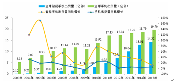 二十一世紀以來,以手機尤其是智能手機為代表的通訊終端迅猛發展,手機全球出貨量由 2003 年的 5.33 億部增長至 2015 年的 19.70 億部, 年均復合增率達到了 11.50%。近年來,智能手機更是由于其獨立的操作系統、獨立的運行空間、 大屏幕的外觀設計等各種現代配置及設計理念滿足了消費者自行安裝第三方軟件等個性化需求而迅速崛起, 2003 年智能手機全球出貨量僅為 957.12 萬部,2007 年該數字便達到了 1.25 億部,與 2003 年相比增長了十余倍。 2013 年,全球智能手機出貨量首次突破十億部,達到了 10.04 億部,相比 2003 年增長了百余倍,比 2007 年全球智能手機出貨量的八倍還多。 2015 年全球智能手機出貨量達到 14.32 億部,同比增長 10.07%; 2010 年至 2015 年,全球智能手機出貨量年均復合增長率高達 36.25%。智能手機產業正在經歷著最黃金的發展時期,智能手機在整個手機通訊設備中的比例由 2003 年的 1.79%已增加至 2015 年的72.69%, 而隨著人們對智能手機更新換代要求的提高和擁有多部智能手機需求的激發,智能手機產業未來幾年仍將保持較快速度的增長,且智能手機將基本完全替代傳統手機的地位。全球手機、智能手機出貨量及同比增長率如下圖所示:
