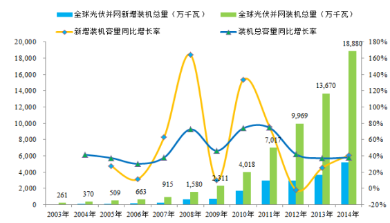 近年來,隨著世界各國對新能源開發的重視、光伏發電技術的提高以及光伏組件、多晶硅價格下降,全球光伏產業迅猛發展, 2003 年全球光伏并網裝機總容量僅為 261.4 萬千瓦, 2008 年該數字達到了 1,580 萬千瓦, 2015 年該數字則達到了 24,226 萬千瓦6,最近十年年均復合增長率高達 44.10%,最近五年年均復合增長率高達 25.64%。同時,全球新增光伏并網裝機新增容量由 2003 年的 56.4萬千瓦上升至 2008 年的 664.9 萬千瓦, 2015 年該數字達到了 5,346 萬千瓦,最近十年年均復合增長率高達 47.16%,最近五年年均復合增長率高達 43.23%。2003年至 2015 年全球光伏并網裝機容量、全球新增光伏并網裝機容量及各自增長率如下圖所示: