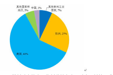 發達國家一直在微創手術器械市場上占據領先位置,美國獨占鰲頭,其約占全球微創手術器械銷售額的 60%,歐洲約占微創手術器械銷售額的 25%,包括中國、印度、俄羅斯、巴西和南非等在內的新興工業國家合計占 10%,其中中國約占整個市場的 3%5。全球微創手術器械市場銷售分部情況如下圖所示: