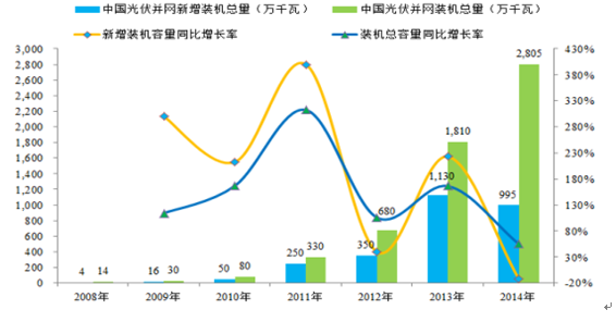 我國光伏產業發展相對發達國家較晚, 但近年來發展速度遠快于世界平均發展速度。 2008 年我國光伏并網裝機容量僅為 14 萬千瓦, 2014 年光伏并網裝機總容量就達到了 2,805 萬千瓦, 2011 年、 2012 年、 2013 年、 2014 年同比增長率分別達到了 312.5%、 106.6%、 166.18%、 54.97%,我國光伏并網新增裝機容量也由2008 年的 4 萬千瓦增長至 2014 年的 995 萬千瓦。 2008 年至 2014 年我國光伏并網裝機容量、全球新增光伏并網裝機容量及各自增長率如下圖所示: