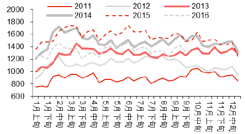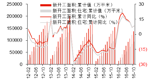 銷售數據向好、開發商補庫存,新開工將維持高位。住宅用地的成交面積在2014 年、2015年分別下降33%、16%,新開工面積在2014 年、2015 年呈現負增長,隨著2015 年下半年以來的銷售加速,開發商需要補庫存。從2015 年9 月開始,商品房新開工累計同比增速開始增長,并于今年年初轉正,2016 年前10 月,商品房新開工累計同比增速達到8%。
