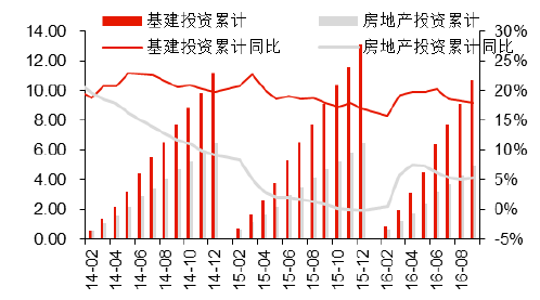從歷史數據看,商品房銷售和房屋新開工領先房地產開發投資半年到1 年,開發投資從2016 年2 月開始轉正。由于目前經濟仍然處于轉型期,新興產業方興未艾,基建和房地產依然是經濟維穩的重要力量,今年國慶節后的房地產調控主要為打壓房價泡沫、并非抑制銷售,因此房地產商的補庫存和新開工也會繼續。