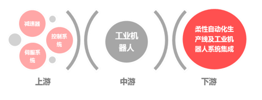 從產(chǎn)業(yè)鏈角度看, 柔性自動(dòng)化生產(chǎn)裝備及工業(yè)機(jī)器人系統(tǒng)應(yīng)用產(chǎn)業(yè)內(nèi)部可分為三部分:上游核心零部件、中游的機(jī)器人本體和下游的柔性自動(dòng)化生產(chǎn)。