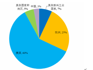 發(fā)達國家一直在微創(chuàng)手術(shù)器械市場上占據(jù)領(lǐng)先位置,美國獨占鰲頭,其約占全球微創(chuàng)手術(shù)器械銷售額的 60%,歐洲約占微創(chuàng)手術(shù)器械銷售額的 25%,包括中國、印度、俄羅斯、巴西和南非等在內(nèi)的新興工業(yè)國家合計占 10%,其中中國約占整個市場的 3%5。全球微創(chuàng)手術(shù)器械市場銷售分部情況如下圖所示: