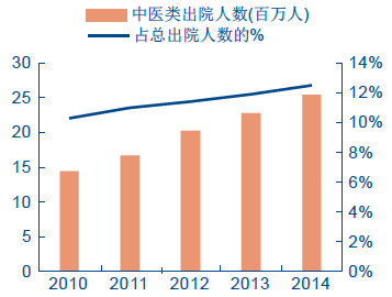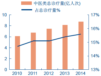 從需求端角度看,2014年我國中醫(yī)類醫(yī)療機構的就診量達8.74億人次,2010-2014年CAGR達9.3%,占總就診量的比例從2010年的14.7%提高到15.6%;2014年中醫(yī)類醫(yī)療機構出院人數(shù)達2,537萬人,2010-2014年CAGR達15.1%,占總出院人數(shù)的比例從10.3%提高到了12.5%。中醫(yī)診療量占總就診量和總出院人數(shù)的比例上升,體現(xiàn)了中醫(yī)診療的需求旺盛、在醫(yī)療服務領域的地位不斷提升。