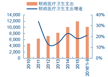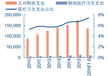 根據(jù)財政部數(shù)據(jù),2016年1-9月我國財政醫(yī)療衛(wèi)生支出(含計劃生育)約1.02億元,同比增長21.14%,同期公共財政支出約13.60億元,同比增長12.67%,醫(yī)療衛(wèi)生支出增速高出整體公共財政支出5.79PCTs。2010年至2016年9月,我國醫(yī)療衛(wèi)生支出的公共財政占比已由5.30%提升至7.48%,提升了2.18PCTs,醫(yī)療健康產(chǎn)業(yè)的財政支持力度不斷加大。