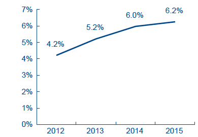 2015 年我國基層醫(yī)療衛(wèi)生機構診療人次43.4 億次,占總診療人次比例為56.4%。按照《國務院辦公廳關于推進分級診療制度建設的指導意見》的政策目標,2017 年基層醫(yī)療衛(wèi)生機構診療量占總診療量比例要達到65%以上,具有顯著的提升空間。