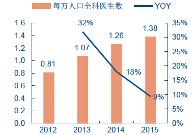 數(shù)據(jù)顯示2015年我國每萬人全科醫(yī)生數(shù)目為1.38人,較2012年的0.81人增加約70%,占醫(yī)生群體的比例也從2012年的4.2%上升至2015年的6.2%,雖然與政策提出的2020年達到每萬名居民有2-3名合格的全科醫(yī)生目標(按照2020年我國人口14億人估算,我國需要約28-42萬名全科醫(yī)生)相比,還有9-23萬人的差距。但考慮到“5+3”培養(yǎng)模式提出至今僅有5年,而全科醫(yī)生的培養(yǎng)周期較長,因此很多全科醫(yī)學專業(yè)的醫(yī)學院學生尚未走出校門(調(diào)查結果顯示目前僅有35%的全科醫(yī)生經(jīng)歷了全科醫(yī)師規(guī)范化培訓,其他主要由內(nèi)科等科室轉崗而來)。我們認為隨著“5+3”培養(yǎng)模式效果的逐步體現(xiàn),全科醫(yī)生的人數(shù)有望穩(wěn)步提升。