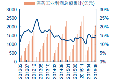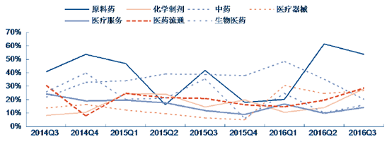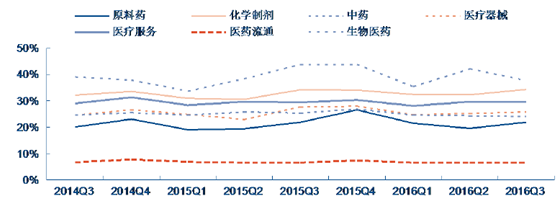 分板塊來看,原料藥板塊同比+53.8%,增速較2015Q3環比提升11.9pcts,受益于提價因素連續兩個季度增速位居各子板塊首位;制劑板塊2016Q3增速達28%,增速較2016Q2環比提升14.0pcts,顯著高于收入端增速,主要由于品種結構的優化導致的毛利率和凈利率提升,同時哈藥股份、華潤雙鶴等外延并購也對業績形成了顯著增厚;中藥板塊同比+14.1%,增速較2016Q2環比提升4.2pcts;醫療器械同比+26.9%,增速較2016Q2環比提升2.4pcts;醫療服務2016Q3保持了20.1%以上的較高增長,但利潤增速有所放緩,較2016Q2環比下降15.2pcts;醫藥流通同比+28.6%,增速較2016Q2環比大幅提升9.0pcts,遠高于收入端,體現出隨著行業集中度的提升,龍頭企業的規模效應逐步顯現;生物醫藥同比+16.0%,增速較2016Q2環比提升5.9pcts,內部分化較為明顯,其中血制品子行業受益于量價齊升保持較高增長,而疫苗行業預計短期內承壓明顯。