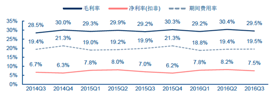 2016Q3醫藥行業凈利率為7.5%,同比增長0.5pcts,主要源于毛利率的提升(+0.4pcts)和期間費用率的有效控制(-0.4pcts)。2016Q2、Q3凈利率較2015年的提升使得行業整體凈利潤增速分別高于收入端增速2.0pcts、8.9pcts。