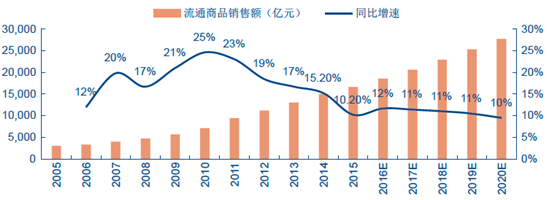 2005-2020E我國醫藥流通市場銷售額及同比增速