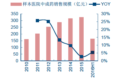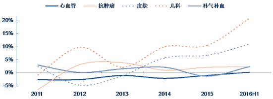 從藥品類型角度,兒科和皮膚用藥銷售規模較小但增速最快,兒科中成藥的占比從2010年的0.97%提升至2016H1的1.42%,皮膚類中成藥占比從1.89%提升至2.07%,兒科和皮膚類中成藥在2010-2015年復合增速分別為21.43%和17.03%。此外,心血管中成藥占比最高,其增速已趨平穩,抗腫瘤類中成藥基本保持略高于行業整體的增速。